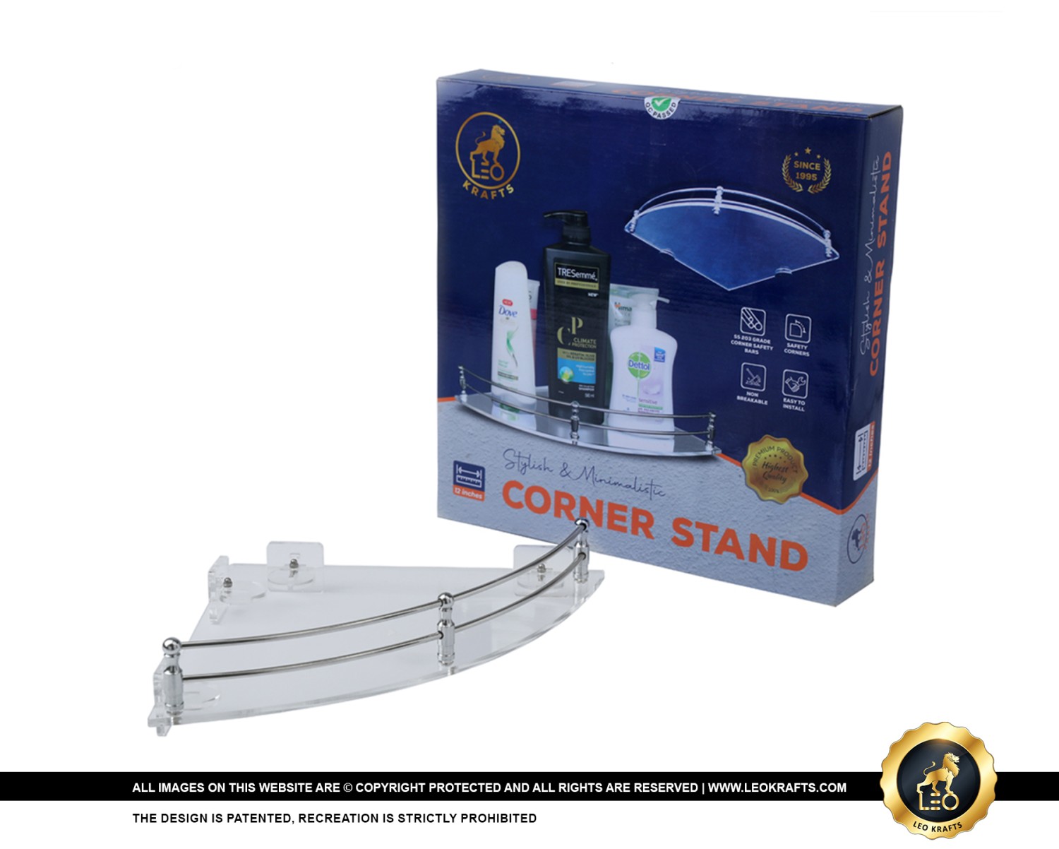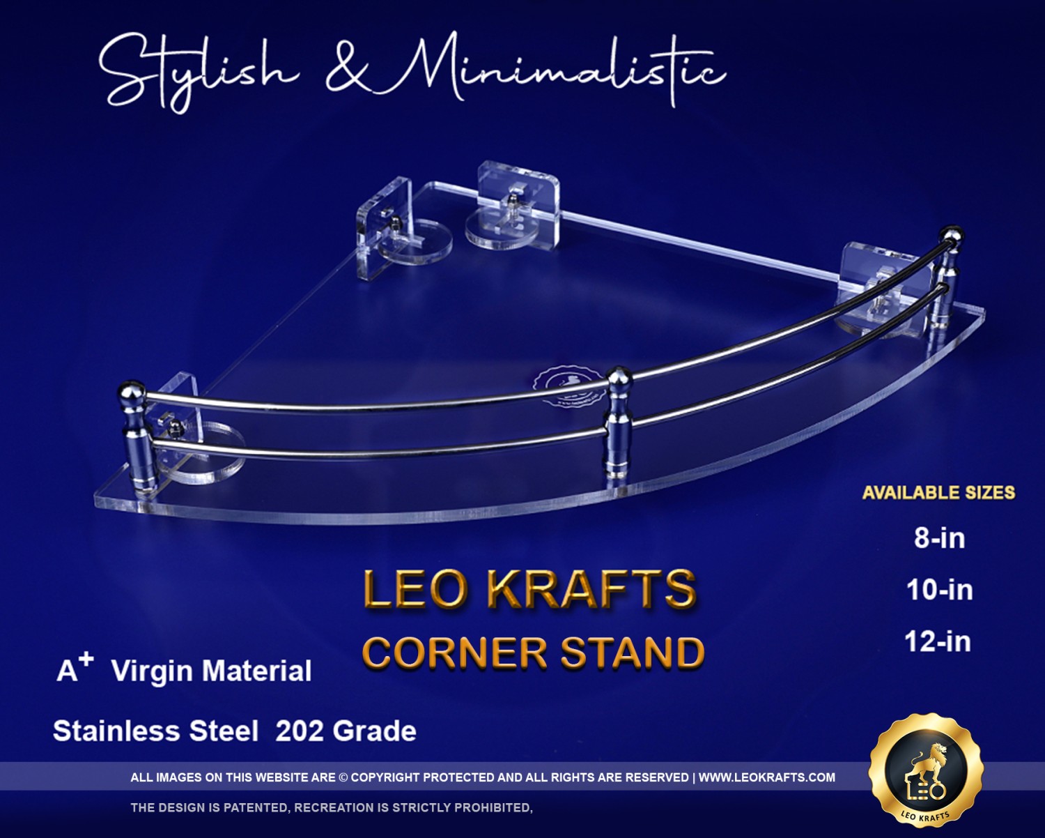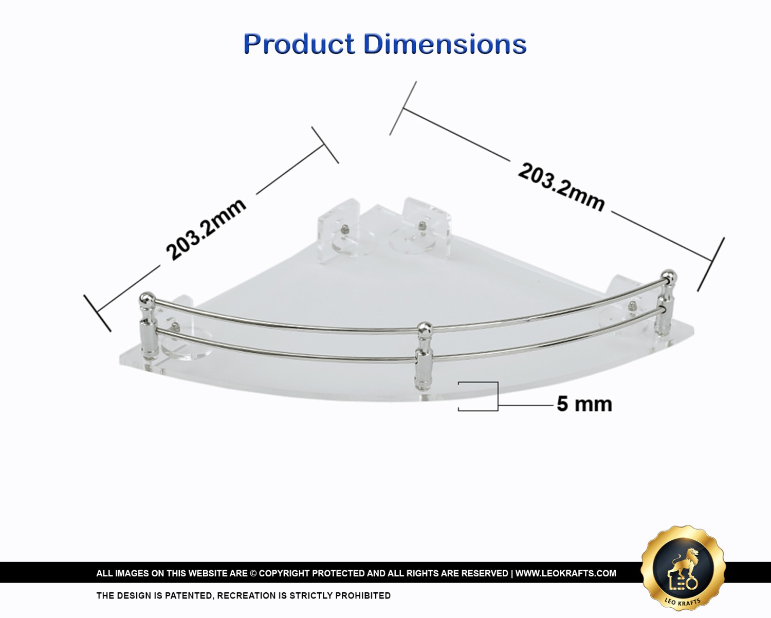 Leo Krafts 8-Inch Corner Stand 5MM, made of 100% Virgin Material. This adhesive-type (203.2 mm x 203.2 mm) Acrylic Wall Shelf is not only stylish and minimalistic, but also eye-catching and practical. It is ideal for use in various areas including the Bathroom, Bedroom, Kitchen, Living Room, and Conference Hall. This durable product is designed for normal usage. It possesses an attractive and elegant look when installed.